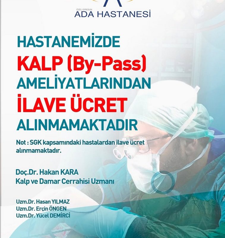 Giresun Ada Hastanesi olarak, hastalarımıza kaliteli sağlık hizmeti sunarken SGK kapsamında yapılan kalp by-pass ameliyatlarından ilave ücret alınmadığını duyurmaktan mutluluk duyuyoruz.